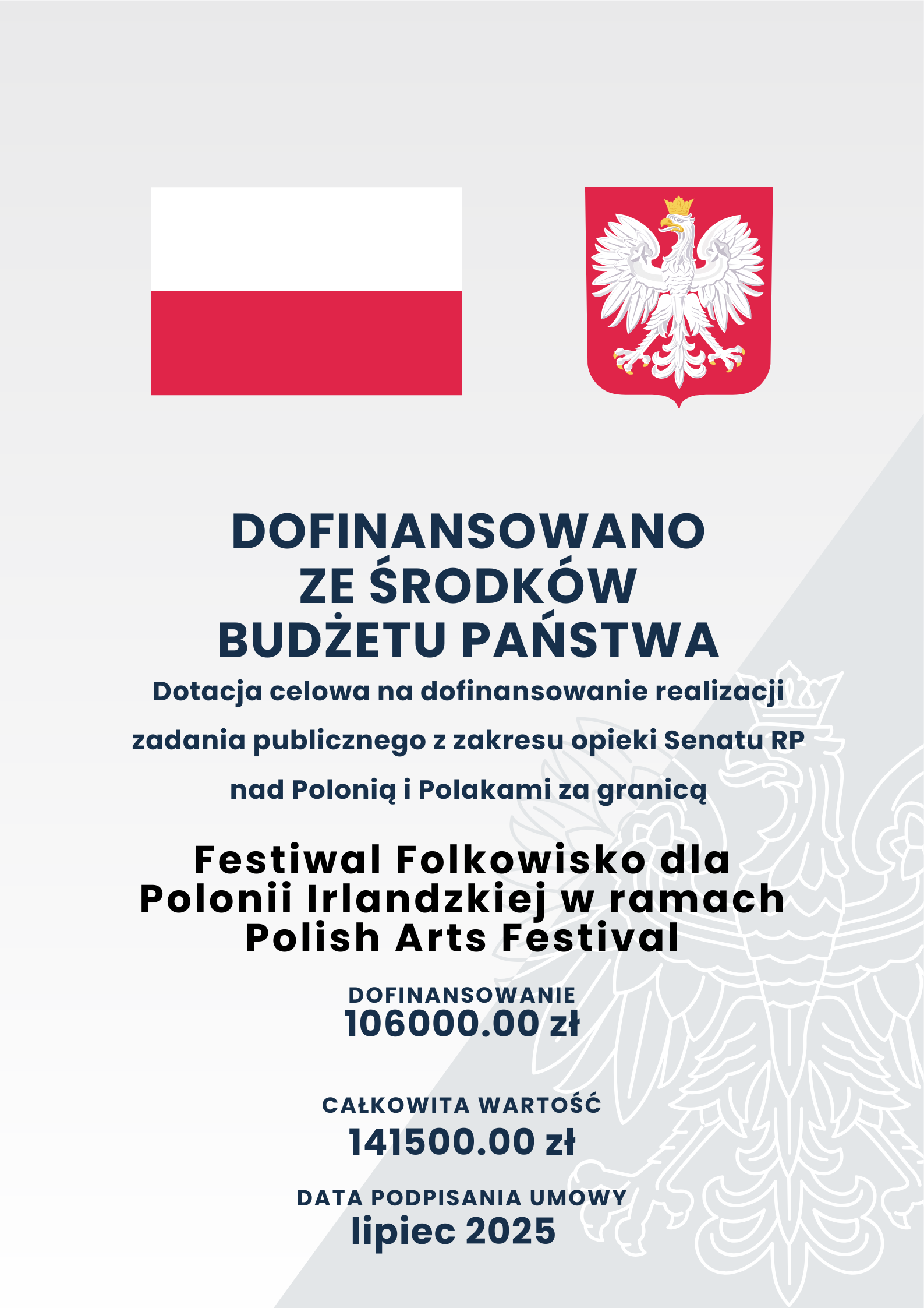 Zadanie „Festiwal Folkowisko dla Polonii Irlandzkiej w ramach Polish Arts Festival” zostało dofinansowane ze środków budżetu państwa.